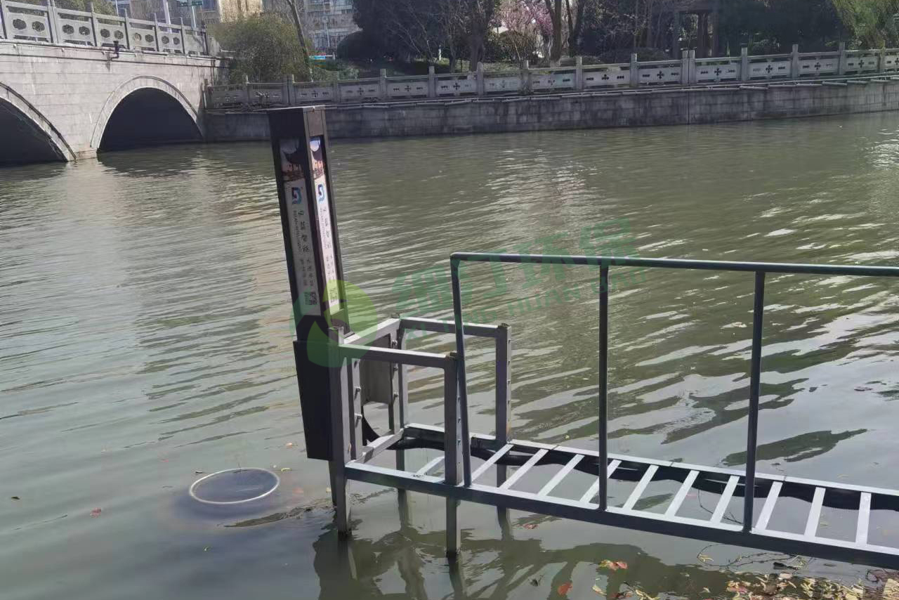 2) 设备升降是否正常:设备正常运行情况下,漂浮式垃圾自动收集器工作水位不得低于 0.5m, 否则会造成设备搁浅无法正常收集垃圾。观察固定杆是否满足最高水位固定设备,否则会造 成设备脱离,或者用绳索二次固定设备于河道边上。防止设备脱逃。